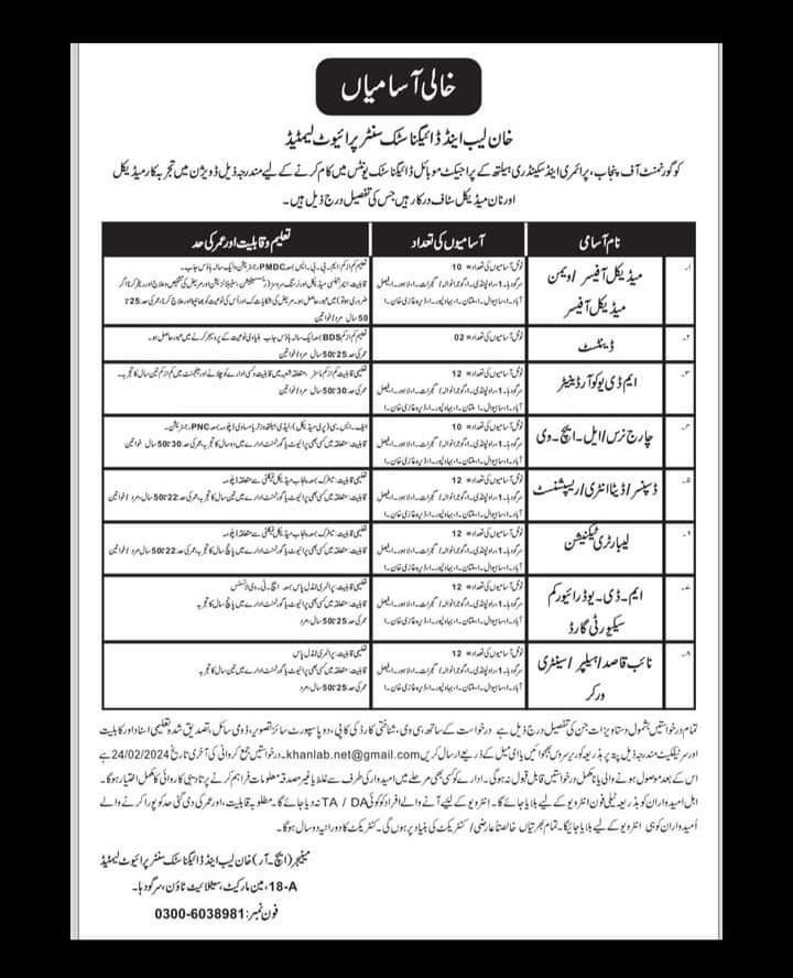 Latest Primary & Secondary Health Care Department Jobs February 2024 Latest 82 Medical & Non Medical Jobs Government of Punjab Mobile Diagnostic Units by Khan Lab & Diagnostic Center Private Limited Apply by Email